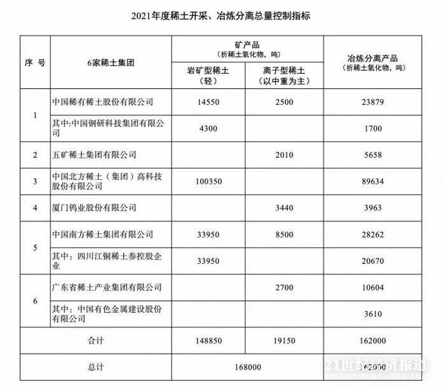 9月30日,工信部下发2021年稀土开采、冶炼分离总量控制指标,由该数据可知,国内六大稀土集团年度岩矿型稀土(即轻稀土)开采总量为14.89万吨,其中北方稀土就拥有10.04万吨的额度,占总量的67.42%;在离子型稀土方面(以中重型稀土为主),由除北方稀土以外的5家稀土集团包括了所有份额。