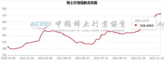 另据中国稀土行业协会数据显示,12月7日,稀土价格指数为338.4,创下年内新高。