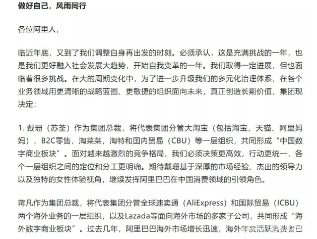 第一,阿里的主业务重组,划归成两个新的板块,分别是中国数字商业、海外数字商业两大板块;第二,管中国数字商业板块的是戴珊;管海外数字商业板块的是蒋凡。