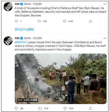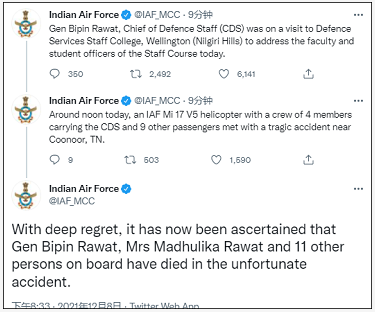 印度空军于其官方推特账号发文确认,现已查明比平·拉瓦特及其夫人等共13人在事故中死亡。