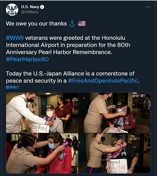 这条预告性质的推文一开始感谢了老兵:“我们欠你们一声谢谢。我们在檀香山国际机场欢迎二战老兵,为珍珠港事件80周年纪念做准备。”