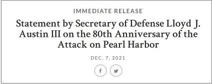 除了美国海军,美国总统拜登、国防部长奥斯汀,以及国防部有关珍珠港事件纪念日的数份声明中,也几乎没有提到过日本。