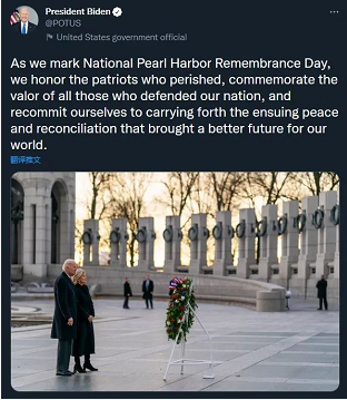 拜登在现场并未讲话。但在推特上,他表示:“在我们纪念珍珠港事件之际,我们向牺牲的爱国者致敬,纪念所有保卫我们国家英勇之人,并再次承诺继续推进,为我们的世界带来更为美好的和平与和解。”