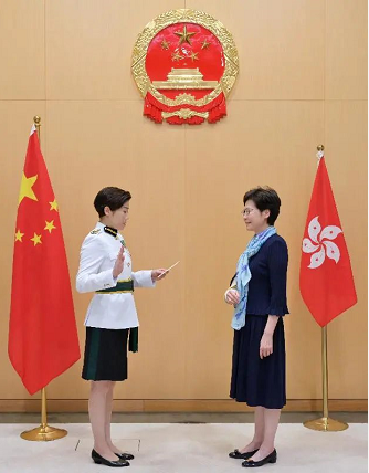 10月21日,何珮珊在香港特区行政长官林郑月娥的监誓下宣誓就职,成为香港海关112年来首位女关长。