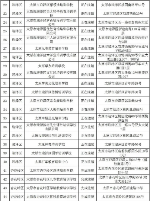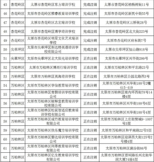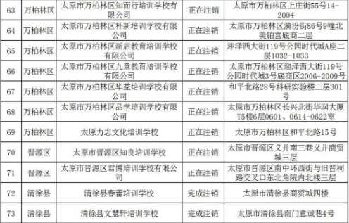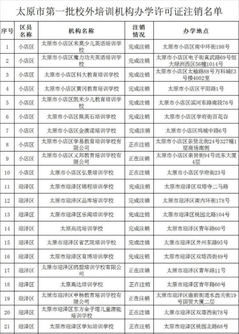 12月9日晚,太原市教育局消息,截至12月6日,太原市已注销73家义务教育阶段学科类校外培训机构办学许可证、法人登记证书,其中45家正在办理手续,进一步规范了我市义务教育阶段学科类校外培训机构办学行为。