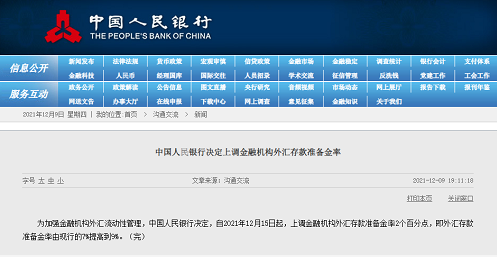 核心提示:为加强金融机构外汇流动性管理,中国人民银行决定,自2021年12月15日起,上调金融机构外汇存款准备金率2个百分点,即外汇存款准备金率由现行的7%提高到9%。