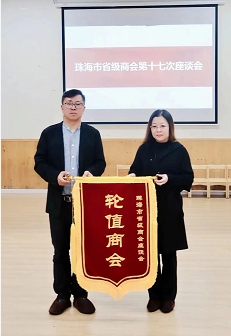 珠海市浙江商会向下一届座谈会轮值商会珠海市山西商会交接会旗。我会秘书长李霞接受会旗。