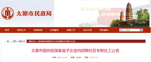 12月11日市民政局消息,为扎实推进党史学习教育,切实减轻低保家庭生活负担,我市将面向本市户籍的低保家庭子女定向招聘502名社区专职社工;被聘用人员享受太原市社区专职社工待遇,符合引进人才政策的人员可享受相应人才补贴。