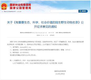 日前,国家林业和草原局发布了《有重要生态、科学、社会价值的陆生野生动物名录(征求意见稿)》,向社会公开征求意见。本次名录调整,以科学评估陆生野生动物物种生态、科学、社会价值为核心,充分考虑种群变化动态、面临威胁、社会关注等多方面因素,提出了名录调整基本原则:一是坚持生态优先;二是维护科研需要;三是有利于社会发展。