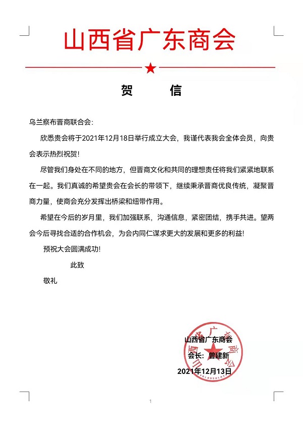 核心提示:山西省广东商会预祝乌兰察布晋商联合会成立大会圆满成功