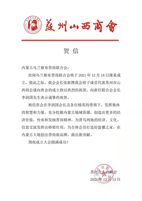 苏州市山西商会预祝乌兰察布晋商联合会成立大会圆满成功