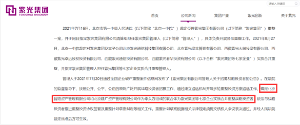 8月27日,北京一中院裁定对紫光集团及其子公司北京紫光通信科技集团有限公司、北京紫光资本管理有限公司、西藏紫光大器投资有限公司、西藏紫光卓远股权投资有限公司、西藏紫光通信投资有限公司、西藏紫光春华投资有限公司(以下合称“紫光集团等七家企业”)实质合并重整,并指定紫光集团管理人担任紫光集团等七家企业实质合并重整管理人。