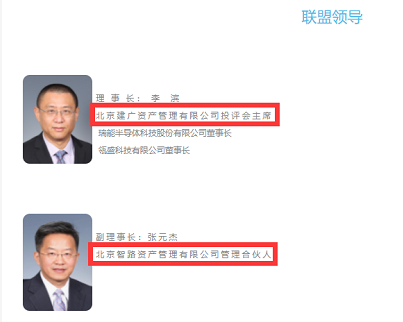 股权结构显示,智路资产实控人为李滨,持股比例达到73.15%,李滨另一个身份是中关村融信金融信息化产业联盟(下称:融信联盟)理事长;智路资产法定代表人、管理合伙人张元杰,拥有多家半导体公司的工作经历,还担任过中国投资有限责任公司资产配置部门董事总经理,他的另外一个身份是融信联盟副理事长。