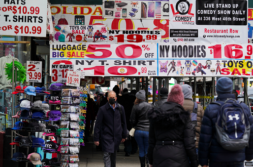 在美国纽约时报广场附近,人们从商品促销广告下走过。新华社记者 王迎 摄