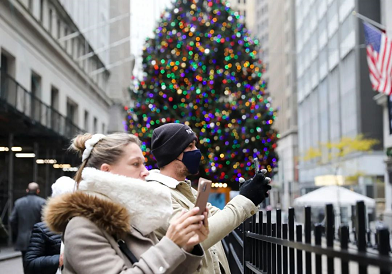 人们在美国纽约证券交易所外拍照。新华社记者 王迎 摄