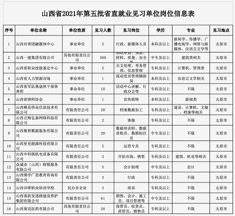 此次公布的见习岗位既包含事业单位也包含企业,地点均在太原市,其中包括山西共青团融媒体中心、山西一建集团有限公司、山西省人力资源市场等,大部分岗位对学历的要求只需专科及以上,专业涉及文史类、建筑类、计算机相关等,部分岗位对专业没有限制。
