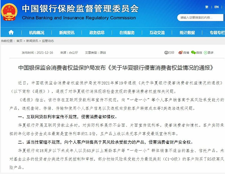 近日,中国银保监会消费者权益保护局发布2021年第19号通报《关于华夏银行侵害消费者权益情况的通报》(以下简称《通报》),通报了对华夏银行消保现场检查发现的侵害消费者权益相关问题。