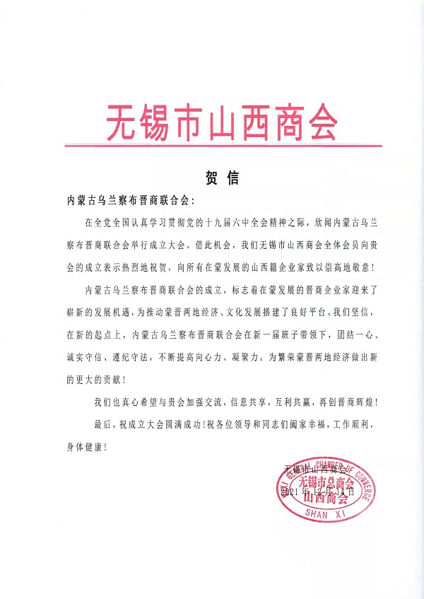 核心提示:无锡市山西商会预祝乌兰察布晋商联合会成立大会圆满成功