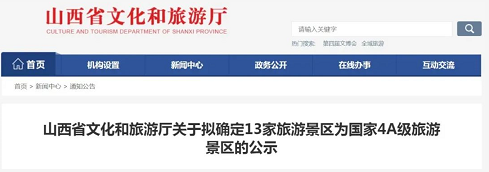 根据中华人民共和国国家标准《旅游景区质量等级的划分与评定》和《旅游景区质量等级管理办法》,经有关市文化和旅游行政部门推荐,山西省文化和旅游厅按程序组织综合评定,以下13家旅游景区达到国家4A级旅游景区标准要求,拟确定为国家4A级旅游景区,现予公示。名单如下: