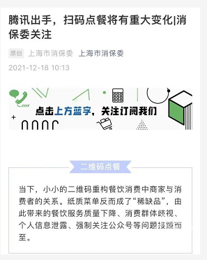12月18日,据“上海市消保委”微信公众号消息,近日,腾讯公司向开发者推送了关于自查“扫码点餐强制关注公众号”问题的通知。