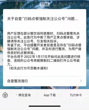 通知指出,平台提醒开发者自查是否存在“扫码点餐强制关注公众号”问题,并及时进行整改,为用户提供良好的点餐体验。平台将于2022年1月17日开始对此类问题进行核查,违规的公众号将被限制二维码打开公众号能力。