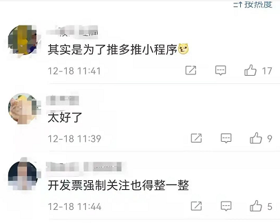 对此,网友纷纷表示,“太好了”、“扫码强制关注是为了推小程序”、“开发票强制关注也该整整”……