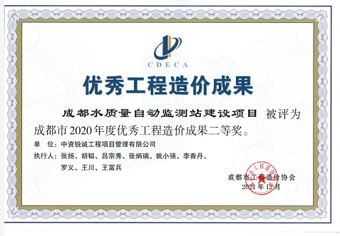 成都水质量自动监测站建设项目评获“成都市2020年度优秀工程造价成果二等奖”;