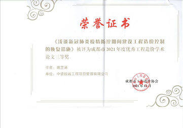 蒋芷涵《浅谈新冠肺炎疫情防控期间建设工程造价控制的恢复措施》被评为成都市2021年度优秀工程造价学术论文三等奖。