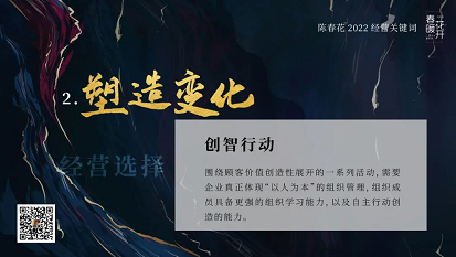 对于今天的企业而言,透过创智行动,拥抱变化,自我加速变化,必须成为一种习惯。唯有此,方可拥有主导市场的力量,以及获得顾客青睐的魅力。转型变革永远在路上,保持谦逊,把每一步都作为起点,变化才是永恒。
