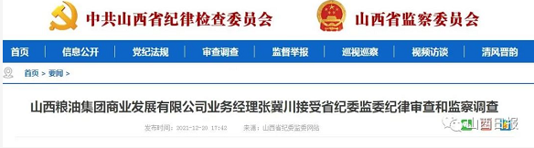 山西粮油集团商业发展有限公司业务经理张冀川接受省纪委监委纪律审查和监察调查
