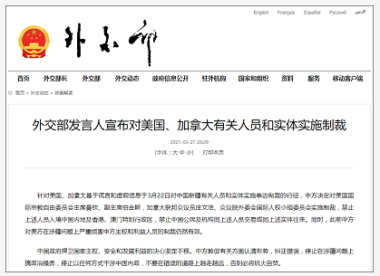 近日,美国国务院和财政部基于谎言和虚假信息,宣布根据美国内法对所谓在新疆“侵犯人权”的4名中方官员实施制裁。12月21日,中国外交部发言人宣布,对等反制美方4名人员。