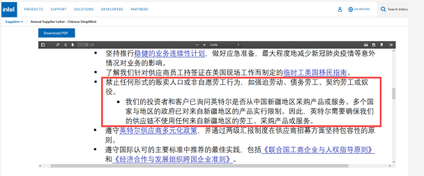 这封信发布于今年12月,是英特尔对供应商的最新要求:禁止任何形式的贩卖人口或非自愿劳工行为,如强迫劳动、债务劳工、契约劳工或奴役。