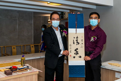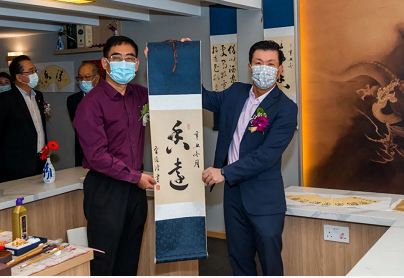 当天,新加坡晋商商会理事、新加坡书法家——贾俊波先生也参加了“汾酒新加坡体验中心”的开幕式活动,并且与在场的各位贵宾分享了他的书法作品。