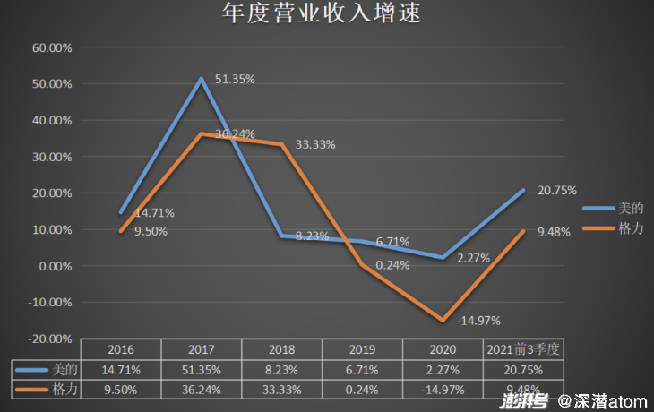 不过,进入到2021年,两家公司都遭遇了成本上升、股价下跌的阵痛,不过格力电器的下跌幅度远超过美的,市场明显对两家公司做了一个区分,目前格力的市值已不到美的的一半。曾经旗鼓相当的两家公司,为何差距如此悬殊?本文主要选择最近五个年度财务报表及2021年半年报及三季报来比较美的集团和格力电器两家公司的造成如此差距的原因。