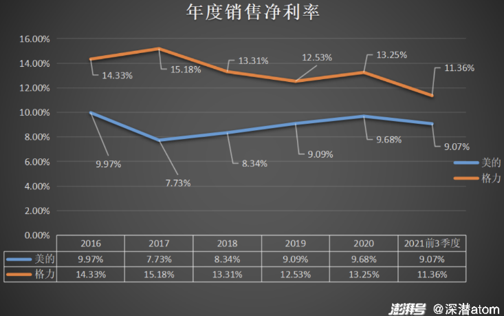 从净利率看,美的集团2016年,2017年,2018年,2019年,2020年,2021年三季度净利率分别为9.97%,7.73%,8.34%,9.09%,9.68%,9.07%,总体看趋势比较平稳;格力电器净利率分别为14.33%,15.18%,13.31%,12.53%,13.25%,11.36%,显著高于美的集团,不过和毛利率呈现出相同的明显下降趋势。