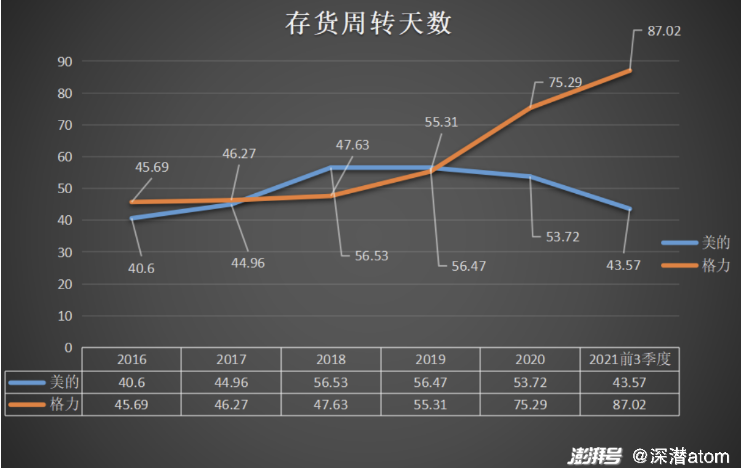 存货周转天数看,美的集团2016年,2017年,2018年,2019年,2020年,2021年前三季度分别为40.60天,44.96天,56.53天,56.47天,53.72天,43.57天,呈现先升后降的趋势;格力电器存货周转天数分别为45.69天,46.27天,47.63天,55.31天,75.29天,87.02天,呈连续上升趋势。美的集团存货周转天数一直小于格力,并且在2021年三季度的仅为格力电器的一半。