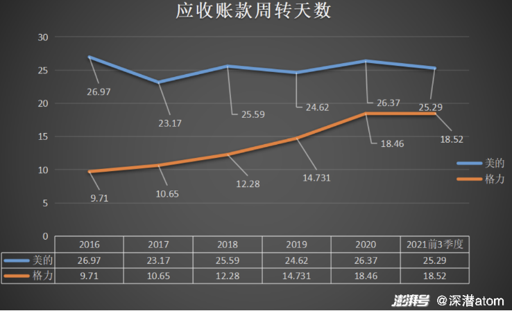 从应收账款周转天数看,美的集团2016年,2017年,2018年,2019年,2020年,2021年前三季度应收账款周转天数分别为26.97天,23.17天,25.59天,24.62天,26.37天,25.29天,基本保持了稳定;格力电器分别为9.71天,10.65天,12.28天,14.731天,18.46天,18.52天,呈现连续上升趋势,但优于美的集团。