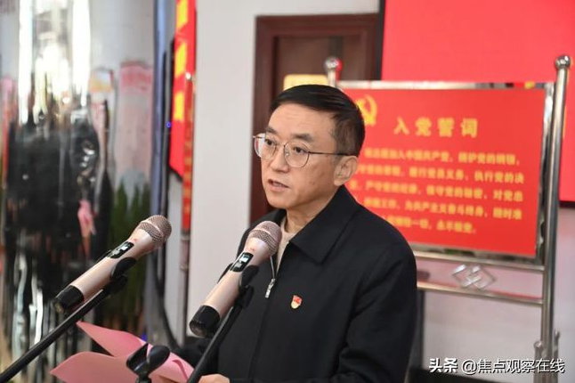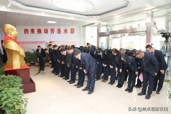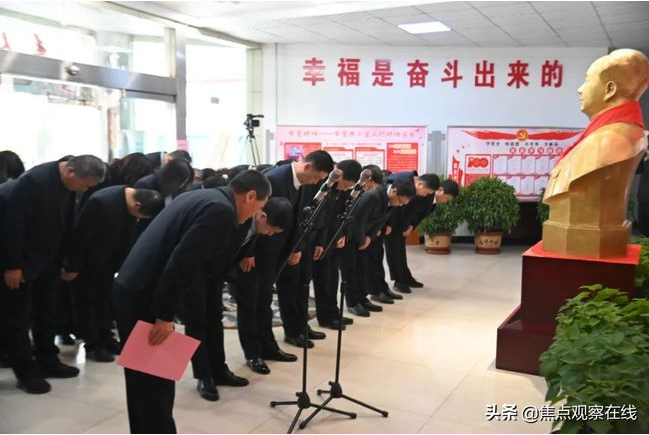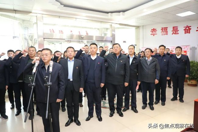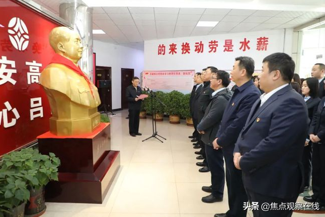 “我志愿加入中国共产党,拥护党的纲领,遵守党的章程,履行党员义务……”为毛主席铜像揭幕后,公司领导班子成员和机关一支部、二支部全体党员在铜像前,整齐列队,身佩党徽,举起右手,拳头紧握,神情严肃,面向党旗重温入党誓词。