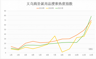 面对疫情、原材料涨价和海运价格大幅上涨等多重不利因素,2021年义乌市场圣诞用品的全年供应情况依然恢复到疫情前的80%,整体采购供应节奏趋于正常。来源:《义乌购圣诞用品搜索热度指数》