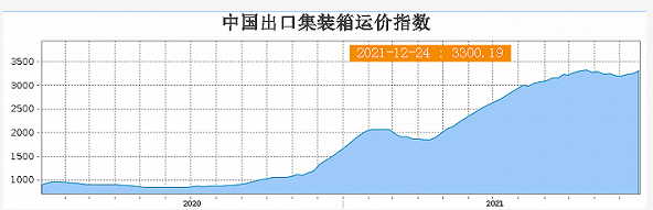 上海航运交易所的中国出口集装箱运价指数在2021年上涨至3200+高位,是去年年初的三倍。来源:上海航运交易所截图