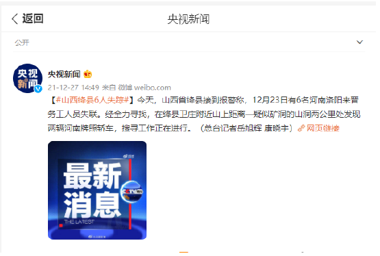 今天,山西省绛县接到报警称,12月23日有6名河南洛阳来晋务工人员失联。经全力寻找,在绛县卫庄附近山上距离一疑似矿洞的山洞两公里处发现两辆河南牌照轿车,搜寻工作正在进行。(总台记者岳旭辉 康晓宇)