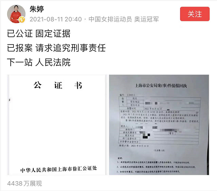 据此前报道,8月11日晚8点40分,中国女排运动员朱婷发布了这样一则消息,同时在博文配图中附上了一张公证书以及一张上海市公安局案(事)件接报回执单。