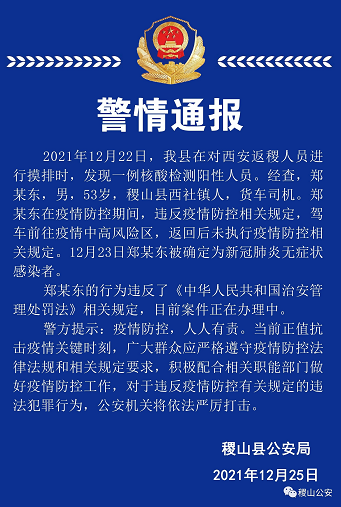 2021年12月22日,稷山县在对西安返稷人员进行摸排时,发现一例核酸检测阳性人员。经查,郑某东,男,53岁,稷山县西社镇人,货车司机。郑某东在疫情防控期间,违反疫情防控相关规定,驾车前往疫情中高风险区,返回后未执行疫情防控相关规定。12月23日郑某东被确定为新冠肺炎无症状感染者。