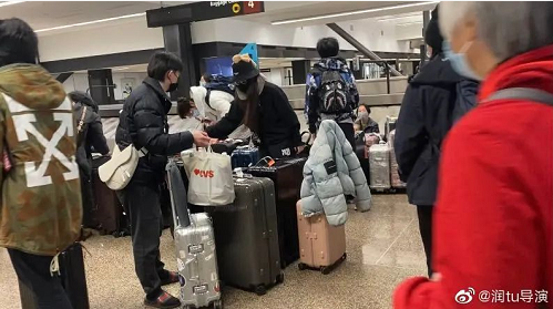 得知2021.12.21DL287的航班无法起飞后,乘客收拾行李并拿起手机通知家人