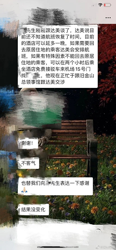 在大使馆志愿者长达三小时与达美的沟通后,原DL287的乘客只获得了酒店一晚上的临时居住权。