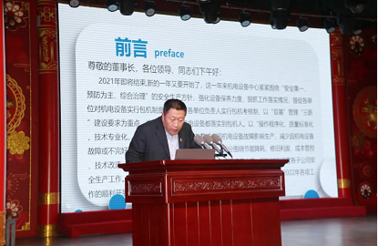 首先,能源公司各副总经理、总经理分别作2021年工作总结暨2022年工作部署。机电设备副总经理梁映章认真总结全年工作,他表示2021年即将结束,一年来机电设备中心紧紧围绕“安全第一、预防为主、综合治理”的安全生产方针,强化设备保养力度,狠抓工作落实情况,督促各单位对机电设备实行包机制度,严格对各单位负责人实行包机考核制,以“双基”管理“三新”建设要求为重点,使各单位每台机电设备都落实到包机人。