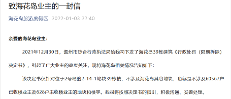 1月3日深夜,恒大童世界集团发布《致海花岛业主的一封信》,就海花岛39栋建筑将被拆一事作出回应。