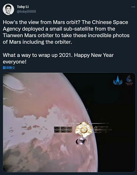 新年伊始,中国火星探测器天问一号就带来一组精美的图像,其中一张环绕器与火星的“自拍照”,更是引起国内外航天爱好者们的惊叹和称赞。