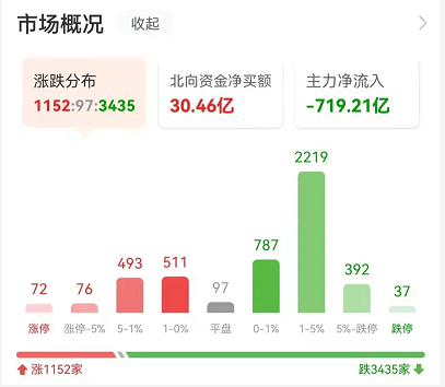 今日三大指数齐跌。沪深两市成交额13052亿,较上个交易日放量388亿,继续放量,总市值较昨日减少了1.2万亿元。截至收盘,沪指跌1.02%,深成指跌1.8%,创业板指跌2.73%。涨跌家数方面,上涨1152家,下跌3435家。
