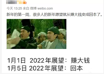 络上还衍生了这么一个段子:1月1日,2022年展望:赚大钱;1月5日,2022年展望:回本。